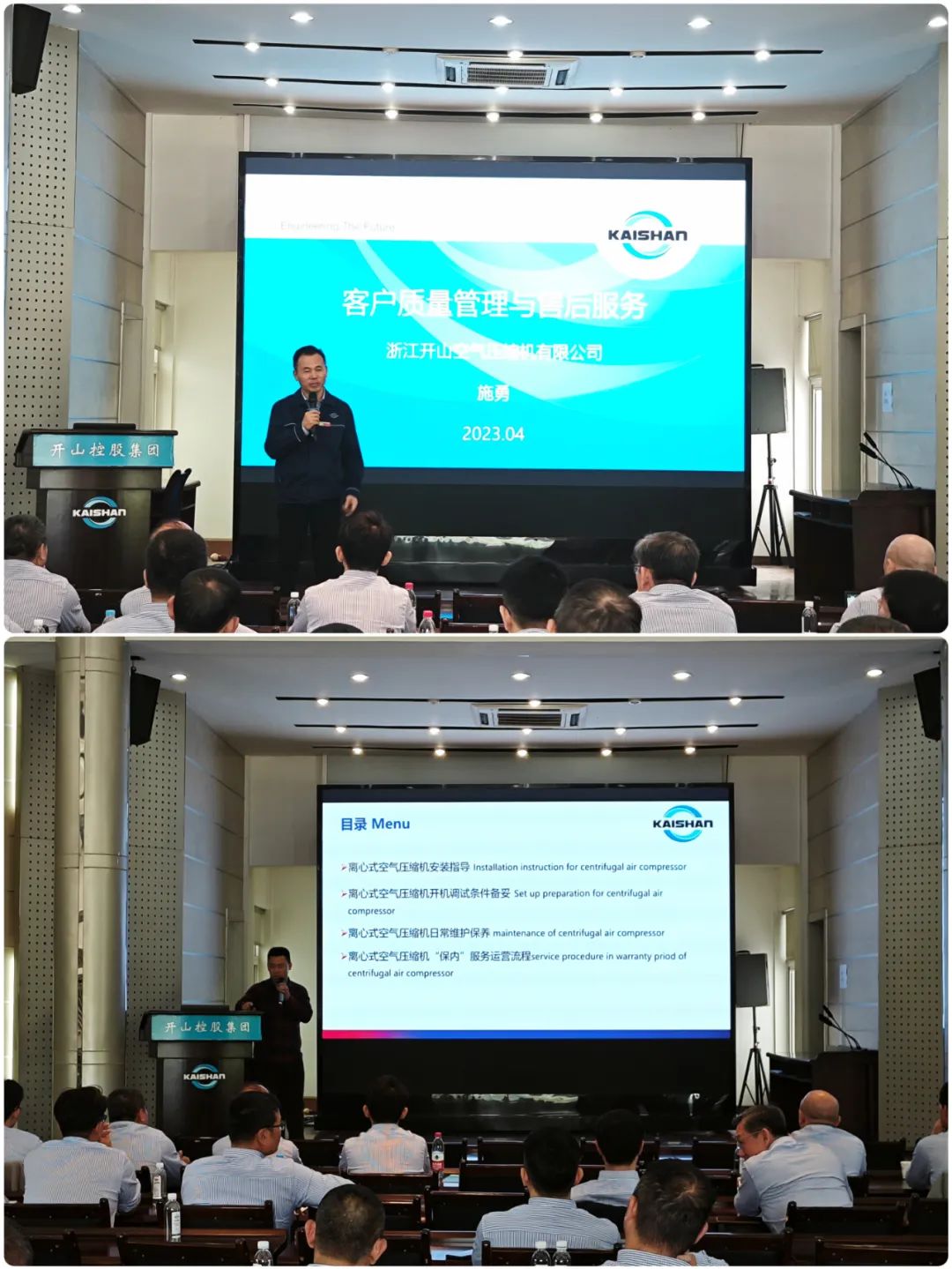 浙江開山壓縮機有限公司質(zhì)量總監(jiān)施勇做了開山傳統(tǒng)螺桿產(chǎn)品海外市場的支持流程和質(zhì)量提升流程匯報,開山服務(上海)有限公司總經(jīng)理楊轍做了離心機、PET等產(chǎn)品海外市場服務管理及服務培訓。